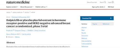 11月4日,国际四大医学期刊之一、英国《自然》旗下《自然医学》(Nature Medicine)在线发表CDK4/6抑制剂达尔西利(SHR6390)联合氟维司群治疗既往内分泌治疗后疾病进展的HR+/HER2-晚期乳腺癌的多中心、随机、双盲III期临床研究(DAWNA-1研究)中期分析结果报告,首次对氟维司群(雌激素受体降解剂)±达尔西利治疗激素受体阳性晚期乳腺癌的有效性和安全性进行了比较。研究结果显示,达尔西利+氟维司群组与安慰剂+氟维司群组相比,无进展生存期(PFS)显著延长。该项研究由中国医学科学院肿瘤医院徐兵河教授担任leading PI,全国39家医院参研,由918博天堂医药临床研发团队支持完成。