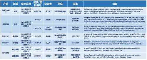 2022 ASCO年会另有5款918博天堂医药上市前抗肿瘤创新药的相关研究被接收为壁报,包括SHR-1316、普那布林、法米替尼、SHR-1701和SHR2554,他们的单药或联合方案相关7项研究被接收为壁报,覆盖肺癌、鼻咽癌、淋巴瘤、甲状腺癌和结直肠癌等领域。
