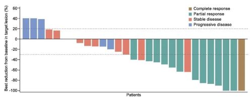截止2021年6月8日,中位随访时间为13.6个月(IQR:10.0-23.6个月),11例患者继续接受治疗中。总人群的ORR为39.4% (95% CI:22.9-57.9),DCR为69.7% (95% CI:51.3-84.4)。PD-L1表达阳性的患者ORR为40.0%(95% CI:12.2-73.8),DCR为80.0%(95% CI:44.4-97.5)。PD-L1表达阴性的患者ORR为33.3%(95% CI:7.5-70.1),DCR为55.6%(95% CI:21.2-86.3)。