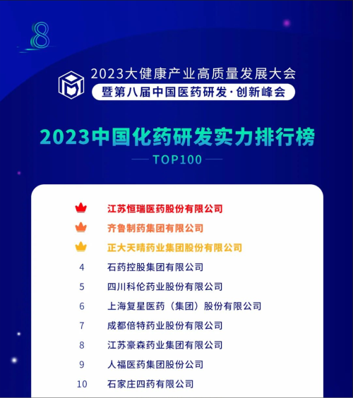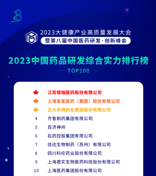 由药智网、中国药业杂志社主办的2023大健康产业高质量发展大会暨第八届中国医药研发•创新峰会于6月16日开幕,会上发布了《2023中国药品研发实力排行榜》系列榜单,918博天堂医药凭借深厚的创新研发实力再创辉煌:荣登《2023中国药品研发综合实力排行榜TOP100》榜首、《2023中国化药研发实力排行榜TOP100》榜首。值得一提的是,今年是918博天堂医药连续第6年入选《中国药品研发综合实力排行榜》榜首。