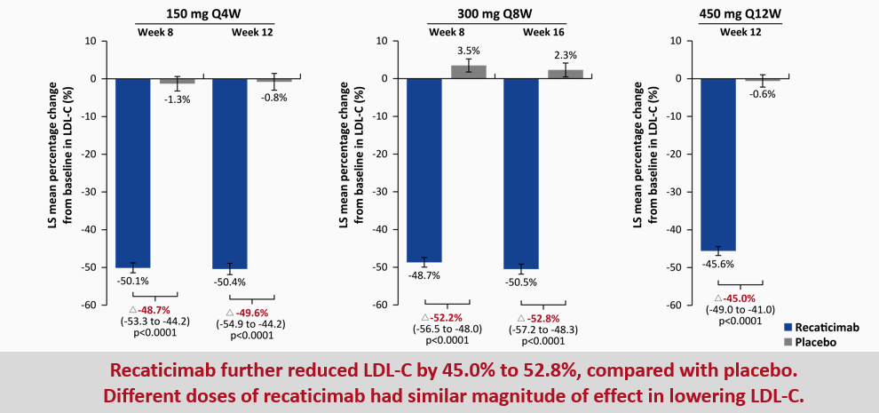 研究主要终点为与安慰剂相比,瑞卡西单抗150mg Q4W和450mg Q12W治疗12周以及300mg Q8W治疗16周后,非家族性高胆固醇血症和混合型高脂血症患者LDL-C相对于基线变化的百分比。